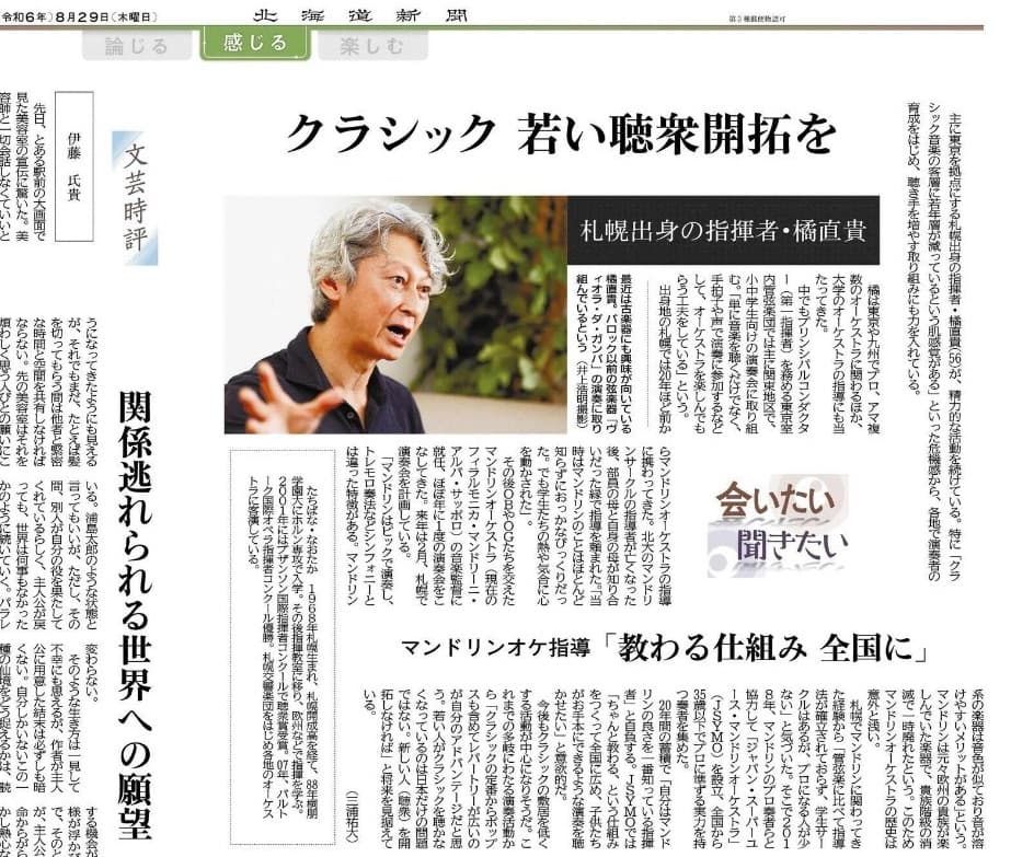指揮者「橘直貴」として、これまでたくさんの人と出会い、さまざまな活動をさせていただきました。僕の感想とか、知人たちの賛辞とかなどではなく、公に発表された新聞記事やインターネット上のページなど、ここを「保管庫」として集めていきたいと思います。それはとりもなおさず「自分自身が何をしてきたのか」ということを自省する場所でもあります。まだまだ手持ちの資料の整理が追いつかず、保管庫というには拙いページですが、どんどんと進化させていきたいと思っております。楽しみにお待ちください。また、ご覧いただいた皆様の中で、「こんな記事をスクラップしている」「こんな写真が残っています」という、何か「指揮者 橘直貴」に縁のものをお持ちの方はぜひご一報ください。
