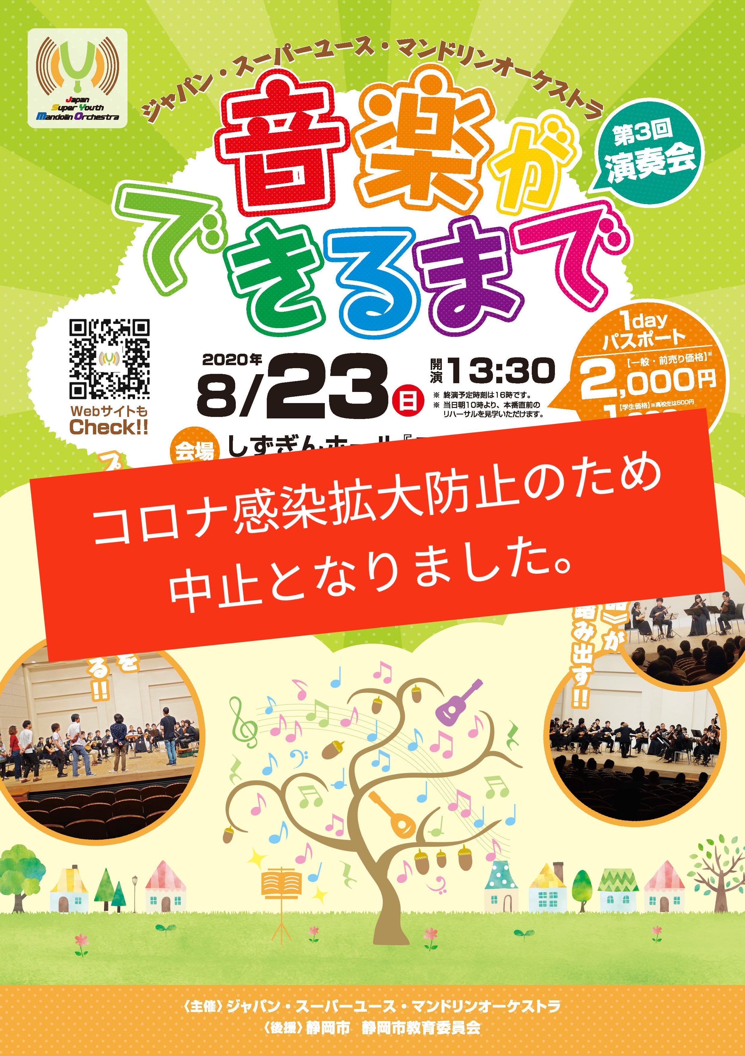 8月23日(日)しずぎんホール『ユーフォニア』で予定されていた「ジャパン・スーパーユースマンドリンオーケストラ第3回演奏会」は、コロナ感染拡大防止のため中止となりました。次回予定が決まりましたらまたご案内させていただきます。お問い合わせはジャパン・スーパーユースマンドリンオーケストラ事務局まで。
