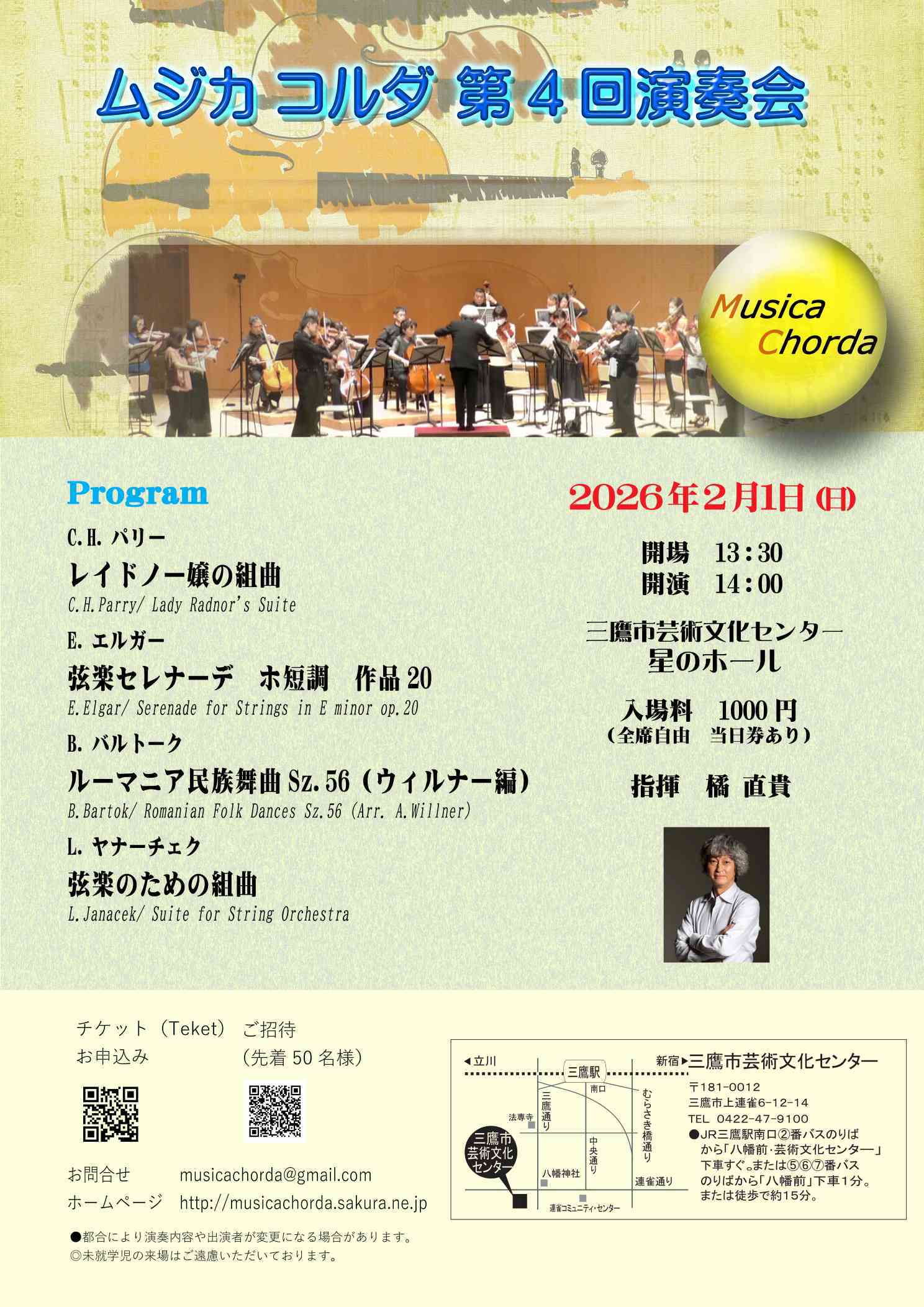 ホームページをご覧になった方で、チケットをご希望の方は下記のアドレスへ「2026年2月1日(日)招待券希望」とご希望の日程をタイトルに、お名前とご連絡先を明記してメールをお送りください。当日受付に置かせていただきます。(規定枚数に達し次第終了させていただきます)。なお演奏会終了後、一定期間保管したあと、名簿は責任を持って廃棄いたします。