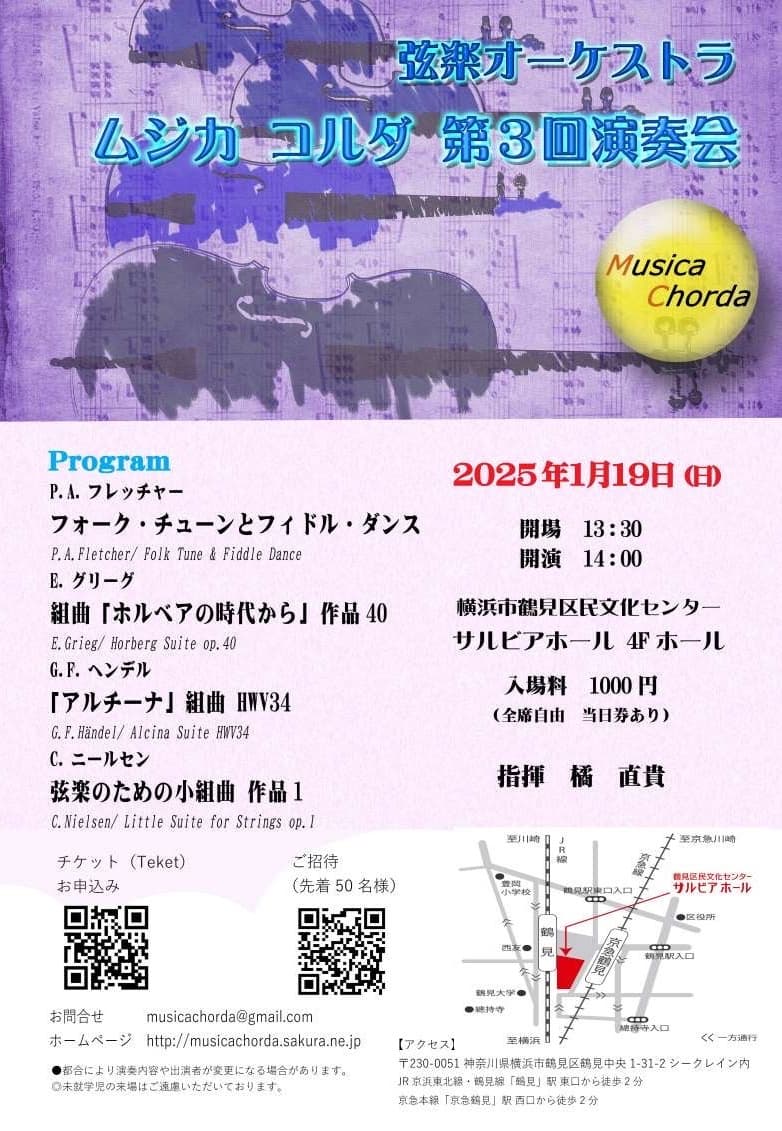 ホームページをご覧になった方で、チケットをご希望の方は下記のアドレスへ「2025年1月19日(日)招待券希望」とご希望の日程をタイトルに、お名前とご連絡先を明記してメールをお送りください。当日受付に置かせていただきます。(規定枚数に達し次第終了させていただきます)。なお演奏会終了後、一定期間保管したあと、名簿は責任を持って廃棄いたします。